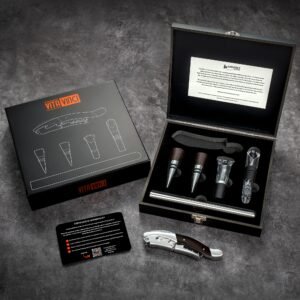 The Vita Vinci Laguiole wine set with 6-pcs is a modern take on the original French Laguiole steak knife. Crafted with the same meticulous attention to detail and high-quality standards as the Vita Vinci steak knives, this wine set is an indispensable tool for wine lovers and oenology professionals alike.